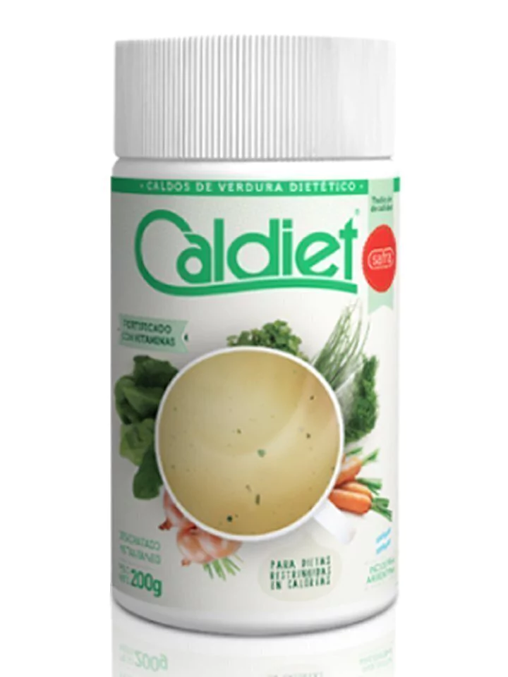 Caldo de verduras dietético. Para dietas restringidas en calorías. Deshidratado e instantáneo. Fortificado con vitaminas. Producto higroscópico.